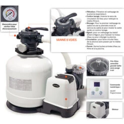Il existe également des combinés filtres à sable + stérilisateurs. Grâce à eux, fini la consommation de produits chimiques, votre appareil assure à la fois la filtration et la désinfection. Vous ajoutez du sel en début de saison puis vous programmez ensuite un cycle quotidien. Simplifiez vous l’entretien de la piscine !