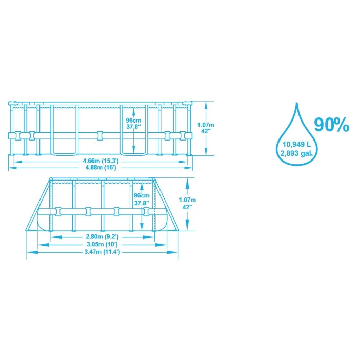 La ligne de piscines Power Steel Frame de Bestway propose des bassins de forme ronde, rectangulaire ou ovale jusqu’Ă 7,32 m de longueur ou 5,49 m de diamètre pour une profondeur variant de 100 Ă 132 cm. Ici profitez d’une piscine ovale de 4,88 m de longueur, 3,05m de largeur et 1,07m de profondeur. Sa forme ovale permet d’avoir un bassin compact qui ne requiert que peu d’espace.